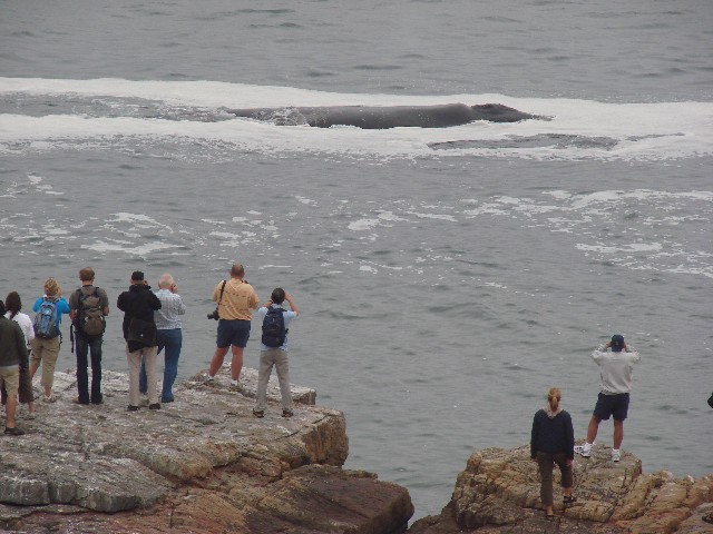 normally dry at this time. In Maputo, Mozambique, I dropped into the South African Airlines ticket office and purchased a round trip ticket from Johannesburg to Cape Town for $200 US. I had to commit to a certain amount of time there, and I selected 16 days. I figured I could always explore the surrounding area if I got bored with the city. Besides, I hadn't spent much time yet in South Africa. I took the overnight bus from From the Johannesburg airport, the flight to Cape Town was an easy two hour flight. I got there in the early afternoon. and took a shuttle bus into the downtown area called "City Bowl" for the hills and mountains that wrap around in almost every direction. I found a single room in a backpacker hotel for $20 per night on Long Street, which was in the heart of the City Bowl. I set off to explore the center of the city. ![]() I walked to the Victoria & Alfred (V & A) Harbour area, which was a new development on the waterfront of shops, malls, restaurants and condominiums. I made official tour arrangements to visit Robbin Island the next day to see the apartheid-era maximum security prison which held Nelson Mandela for over 20 years. It was a one-hour boat ride out to Robbin Island. Then we boarded a bus and were given an explanation of the prison and the workings of the evil apartheid government. We drove to the limestone pit mine, where the prisoners had to break limestone rocks and carry them to a big pile, only to move that pile of rocks from place to place just to make work. When we drove to the prison itself, we were greeted by our next tour guide. All the prison guides were former political prisoners who had lived in the prison, so they were very qualified to speak about the prison environment. One of my in-town excursions was a hike to the top of Table Mountain (aerial photo). Table Mountain, at 3,000 feet elevation, forms the scenic backdrop to the entire City Bowl area of Cape Town. From my hotel in the middle of the city, it was only a one-half hour walk to the base of Table Mountain where you could take a gondola to the top. But my choice was to hike up one of the several hundred hiking trails to the summit. From the base, it took me about one and one-half hour to get to the top of this mountain. Up on top, there were lots of paved walkways to explore. I was lucky to have a nice clear day with no wind or clouds and great views to the city below. Cape Town - City Bowl area from the top of Table Mountain One day I rented a small car and drove to Point Aguilla, the southern-most point of Africa where the Indian Ocean meets the Atlantic. It was a very barren area with rolling hills. Later that same day I drove to Hermanas, a small city which claims the best land-based whale watching on earth. From the cliffs on shore, I could see over a dozen whales offshore, many of them very close to shore and they were exhibiting different behaviors such as breaching and "standing" with their tail fin out of the water. Another day I took the suburban train to Simons Town. The two hour round trip rail trip cost less than $3, which was less than I paid for my lunch that day. In Simons Town, I walked a short distance to Boulders Beach National Park. This is a beach area inhabited by thousands of Cape penguins. They nest in the beach sand. The area immediately north of Cape Town is wine country, and I spent one full day on a guided wine tour. The Western Cape wines are very good quality and very reasonably priced. Our group visited four different wineries for tastings, and the tour included a nice lunch (with wine, or course).